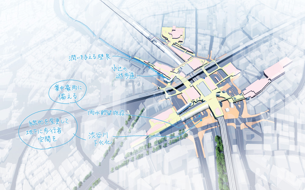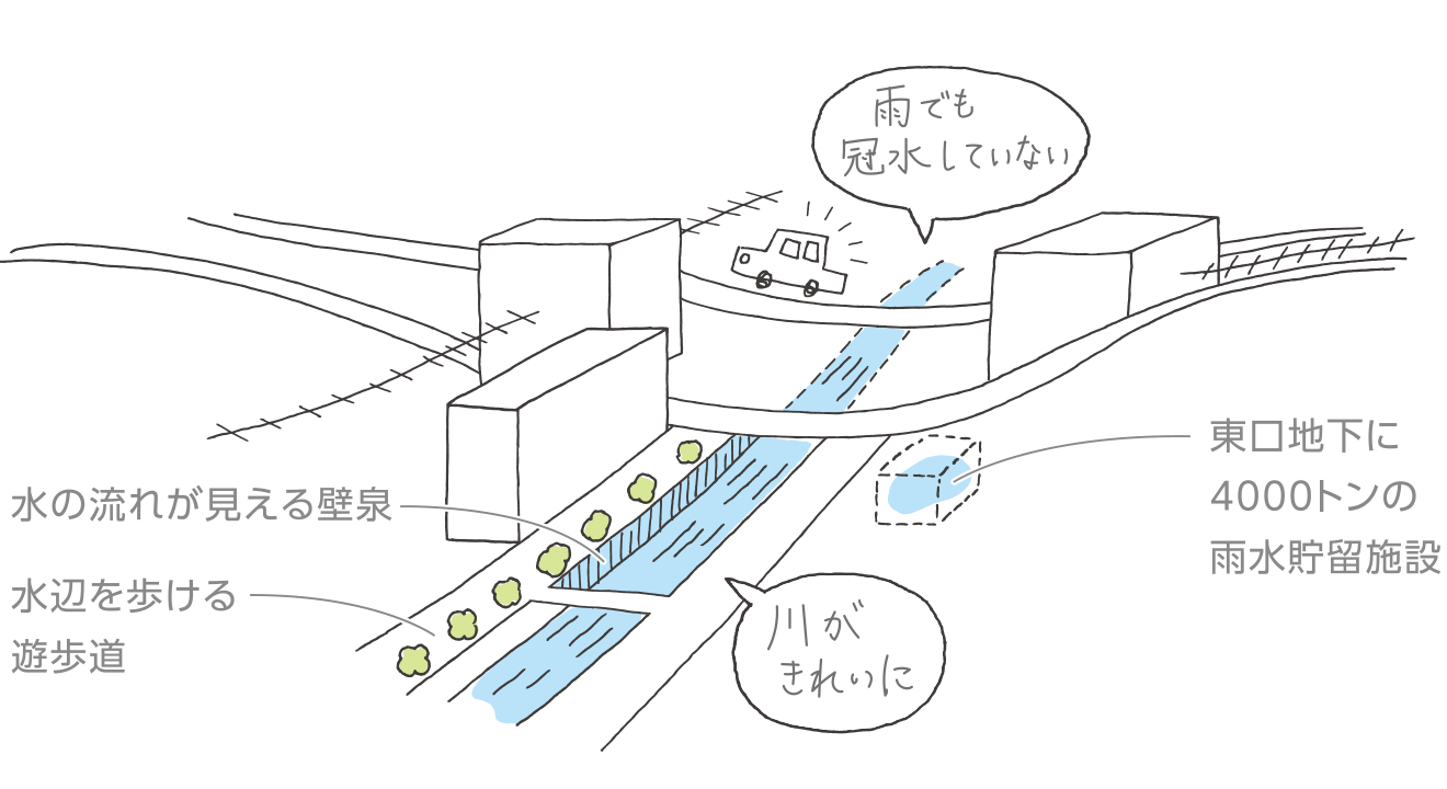 そこで、渋谷川を活かした再生プランを提案、川を表舞台に出すとともに、地下に雨水貯留施設を設けて谷底に集まる水を制御することにしました。
