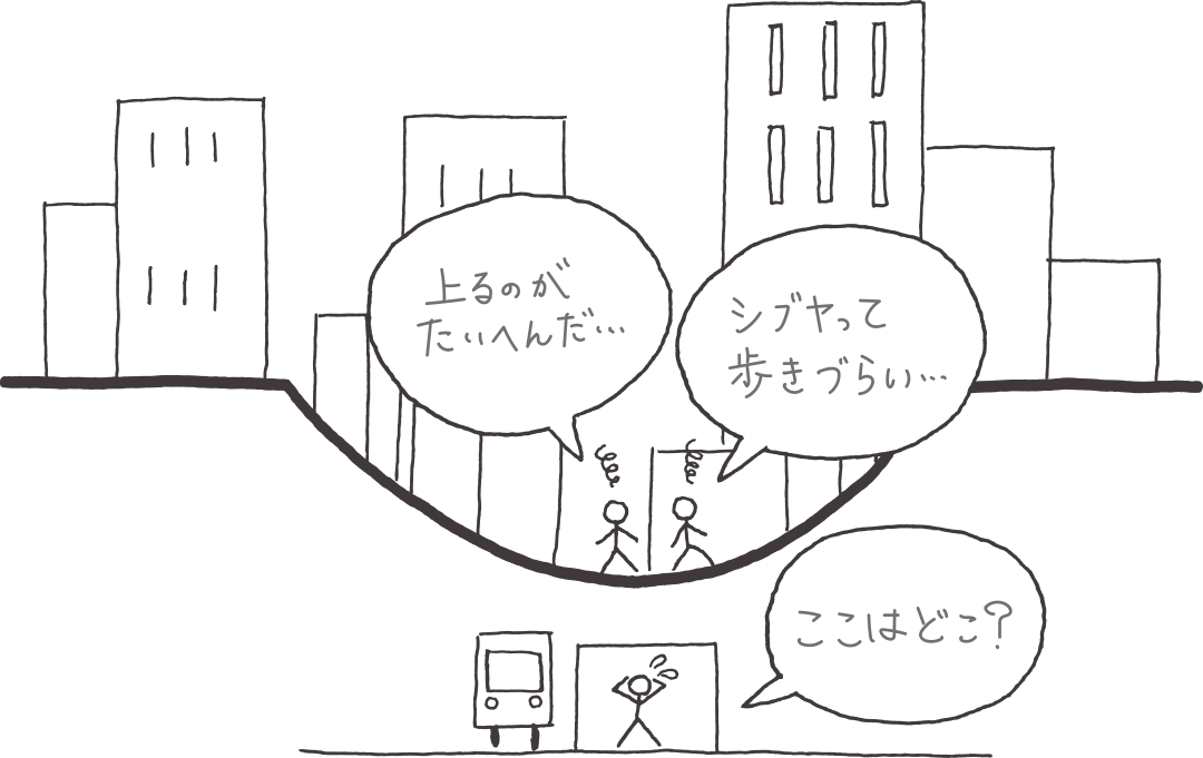 谷地形である渋谷駅周辺は、建物や施設のレベルが多層で、段差が多く、スムーズな移動が困難でした。