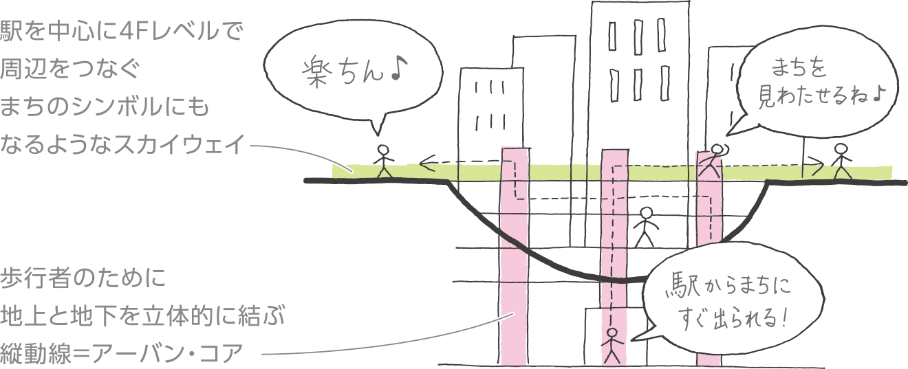 そこで、地上と地下を立体的に結ぶ縦動線と横動線を新たにつくり、誰もが歩きやすい、そして歩きたくなる歩行者ネットワークの整備を進めることにしました。