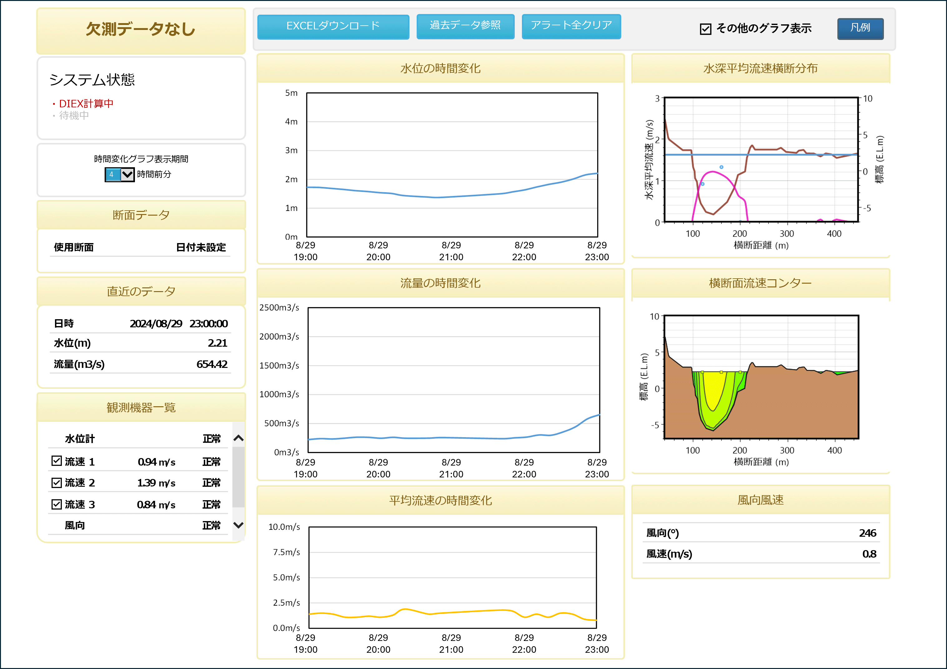 観測データ(水位、流速)及びDIEX法により算出した流量データの時間変化をグラフで表示しています。