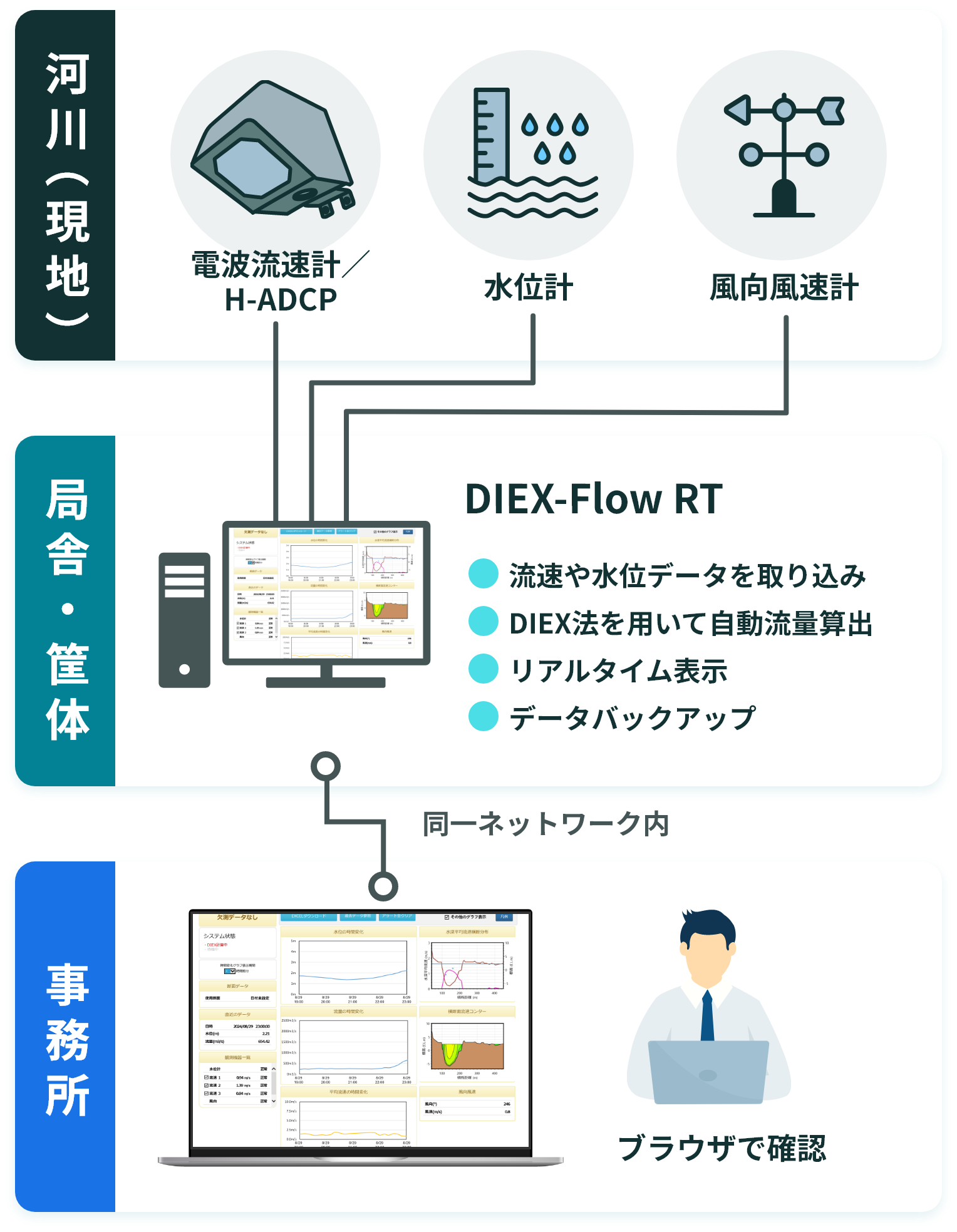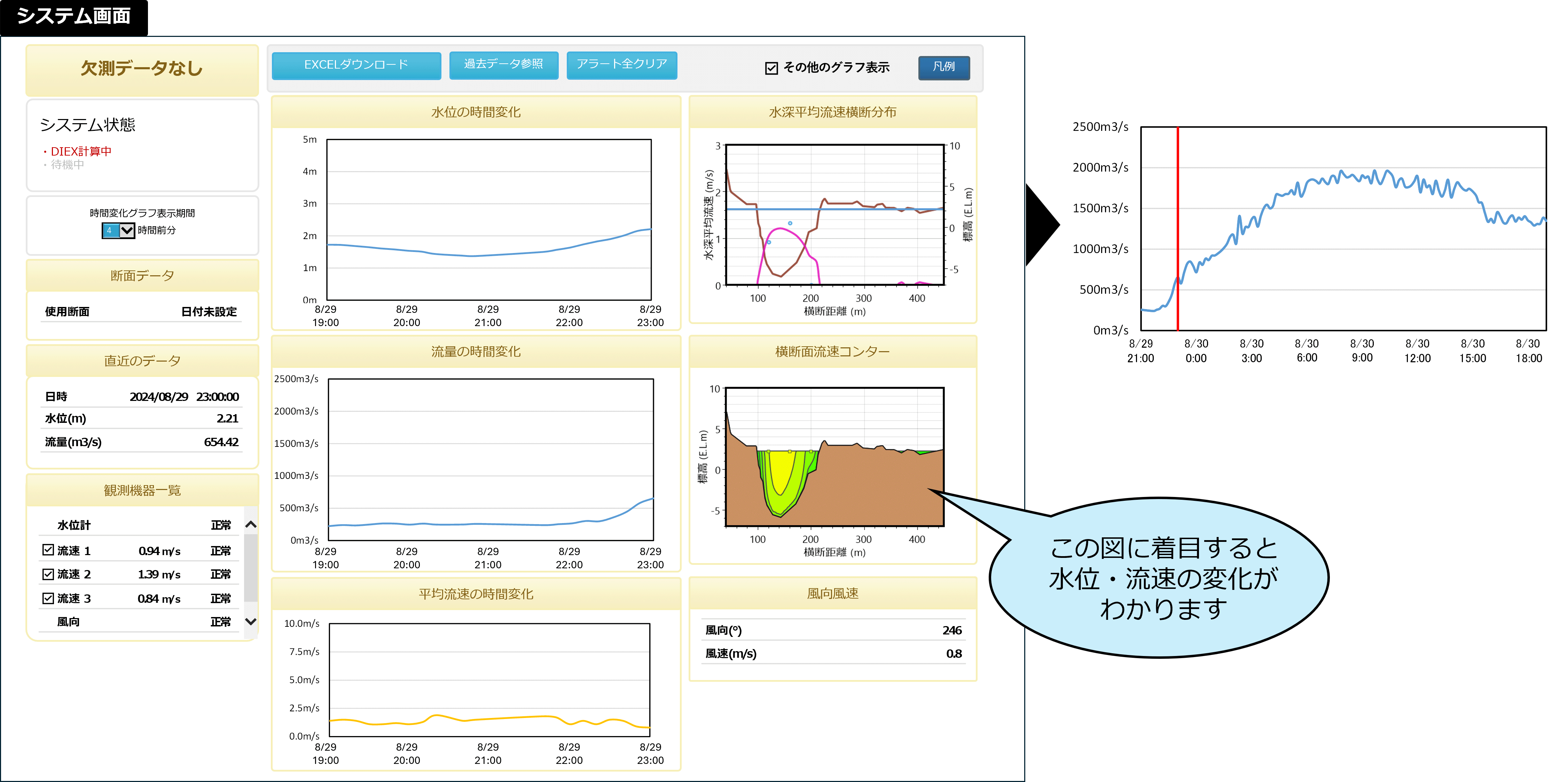 流速や水位データを用いて、自動的に流量算出を実行するシステムです。
