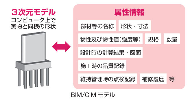 BIM/CIMはBuilding / Construction Information Modeling, Managementを略したもので、調査・計画・設計段階からBIM/CIM(後述)を導入し、その後の施工、維持管理の各段階においても情報を充実させながらこれを活用することを指しています。原則適用も2023年度から始まっています。BIM/CIMとは、地形や構造物などの形状を3次元で表現した「3次元モデル」と「属性情報」(3次元モデルに付与する、部材の名称や形状、寸法、物性、数量など)を組み合わせたものです。