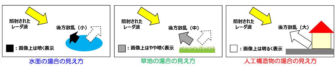 SAR衛星は観測対象に照射したマイクロ波の反射の強弱で表面の状態を把握します。マイクロ波が照射された方向に戻ることを「後方散乱」と呼びますが、森林や都市部など障害物や凹凸が多いところでは後方散乱が強くなり、SAR画像上では明るく(白く)表示されます。逆に、海のように滑らかな面では、ほとんど前方に反射してしまうため後方散乱が弱く画像上では暗くなります。また、後方散乱の大きさには、地上面の状態・地物の有無・種類や材質、土壌水分量などが影響します。こうした散乱特性の違いを解析することで、地上の状況や変化を推定することができます。