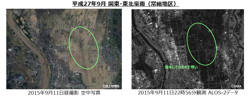 災害発生時には、社会インフラの供用可否判断、救急救命や避難指示・誘導、避難所の開設及び避難物資の輸送などのために、早期かつ迅速に被災状況を把握することが必要になりますが、時間や天候、建物倒壊による道路閉塞、マンパワーの制約などにより情報収集には制約が生じます。その際、SAR衛星を活用すれば広範囲を面的に観測し、被災の程度が把握できます。その観測データを解析することで、発災直後の迅速な被害状況の取りまとめや、ヘリ調査・地上調査の範囲の絞り込み、動員計画づくり、推定浸水面積からの必要排水量の算定や排水ポンプの配置計画の検討などを行うことができます。