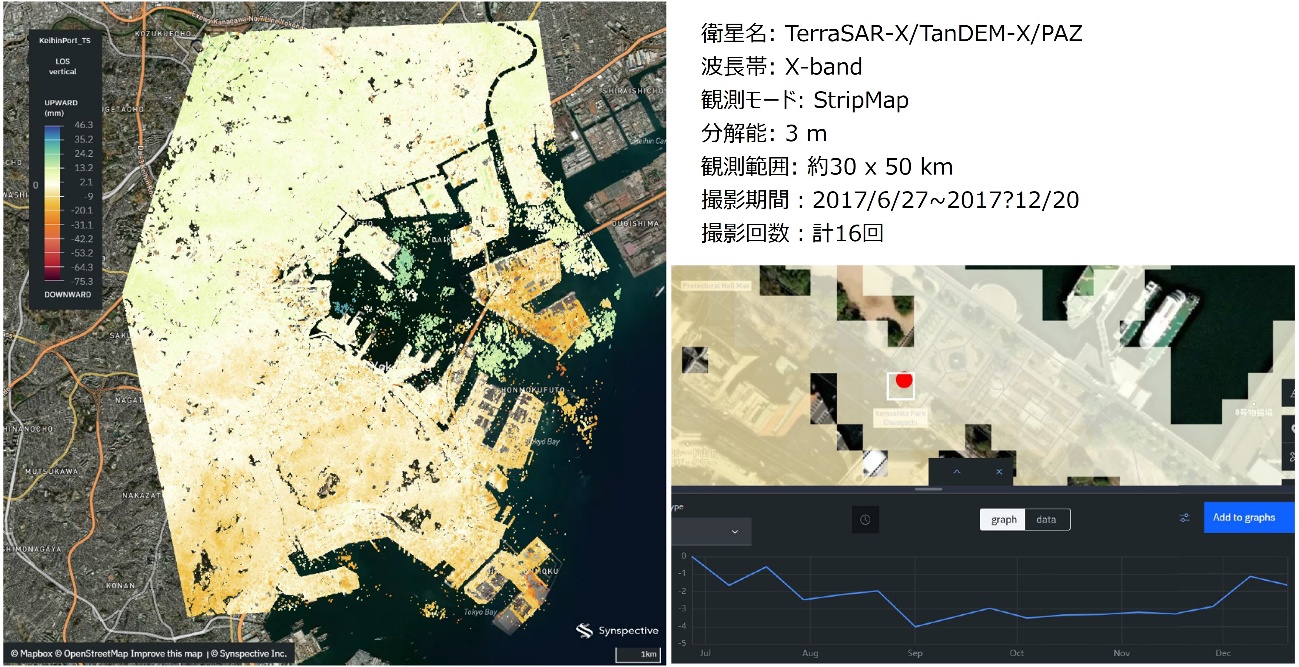 加えて、被災前後の観測データの差分を解析することで、津波や洪水による浸水範囲を捉えたり、複数時期の観測データを解析し、地盤沈下や、堤防・護岸・ダムなどのコンクリート構造物の沈下、背後の土圧の影響による水平方向への移動などを数センチ~数ミリ単位で把握したりすることができます。従来、こうした地盤の動きや構造物の変化を正確に把握しようとすれば、人がその場に出向いて測量しなければなりませんでした。