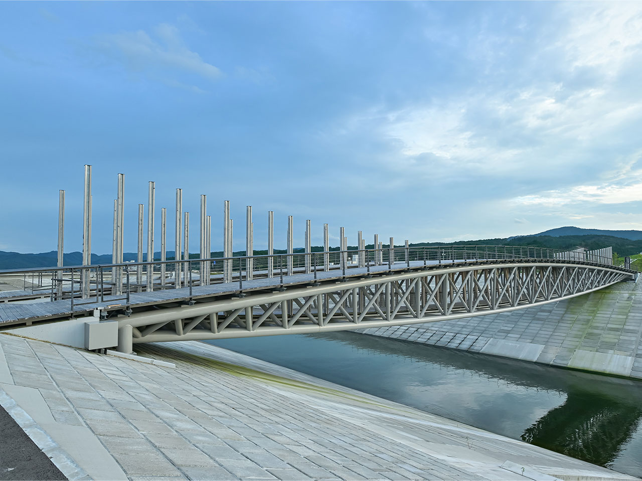 この設計案は当初の「逆三角形に細木を組んで床版を支える木製の太鼓橋」というイメージを踏襲しながらも、橋体を鋼製パイプによるトラス構造に置き換えることにした。「橋でまず問われる構造の安全性、安定性を確保しました。ただし、それによって橋に無骨な印象が生まれることは避けなければなりません。3Dモデルによる立体解析を繰り返して、各部材のサイズをぎりぎりの寸法にまで削ぎ落としました。また、橋台についても、橋の軽快な水平基調のラインを阻害しないよう橋座面まで堤体内に埋め込み、まるで空から降ってきて地上にそっと置かれたような橋に仕上げました」