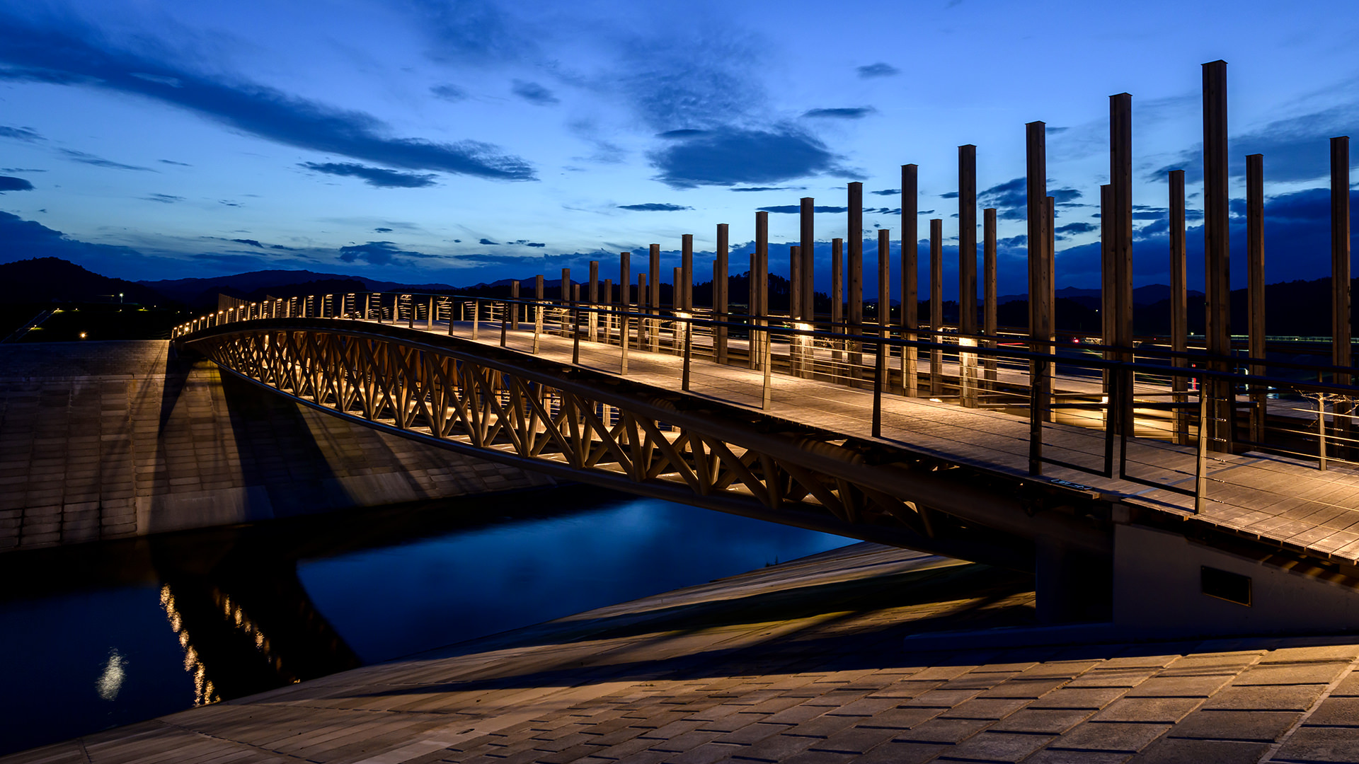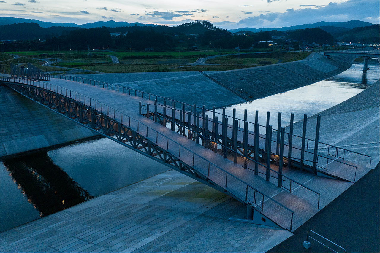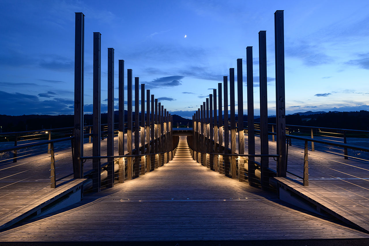 さらに高欄を横桟式にすることで、橋を渡るときの眺望を遮らないような形とした。また手すりの笠木の中には照明を組み込んで足元を照らし、夜間の印象的な風景を演出している。