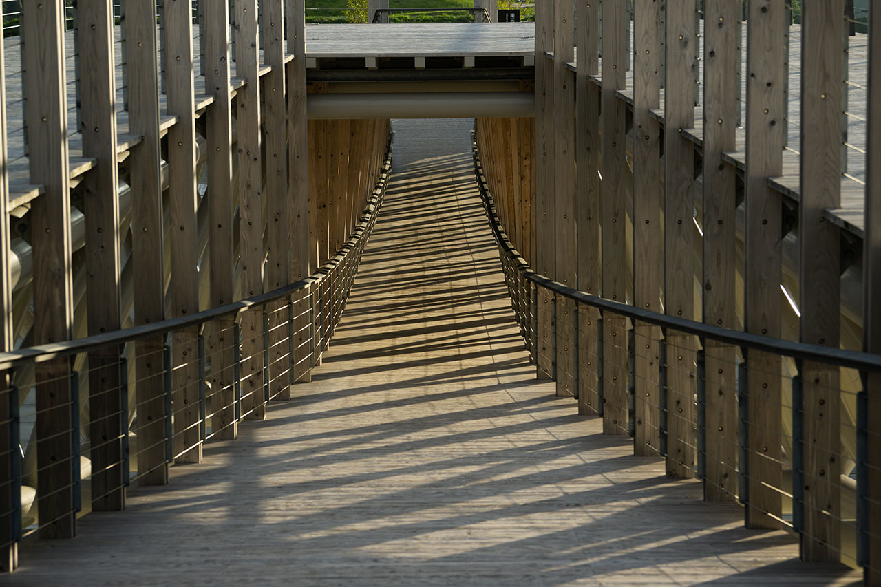 さらに齊藤が独自に工夫したことがあった。それは橋の真ん中に、逆アーチ状に水面へ近づきながら対岸に渡るルートを設けて、ダブルデッキ構造にしたことだ。「当初はその考えはありませんでした。しかし、設計を進めていくにつれて、橋の中央部に、構造上最大3mの構造高さが必要となり、そこにある程度の空間ができました。この空間を活用して、水面に近づく第2のデッキを設け、どちらを通っても対岸に渡れるようにしました。1つの橋を渡るにも異なる2つの景色が楽しめます」