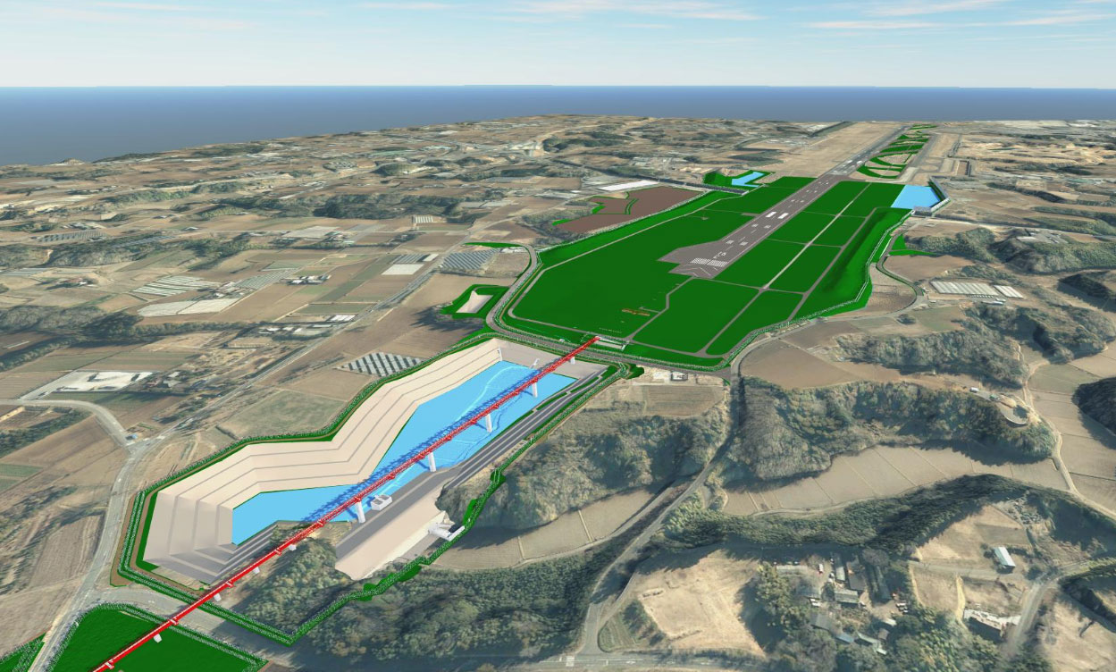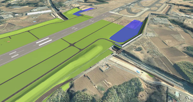 • 工事内容:B滑走路延伸(滑走路長2,500m ⇒3,500m)/C滑走路新設(滑走路長3,500m)/誘導路新設(7,471m)/空港敷地拡張1,099ha(現状1,198ha ⇒2,297ha)