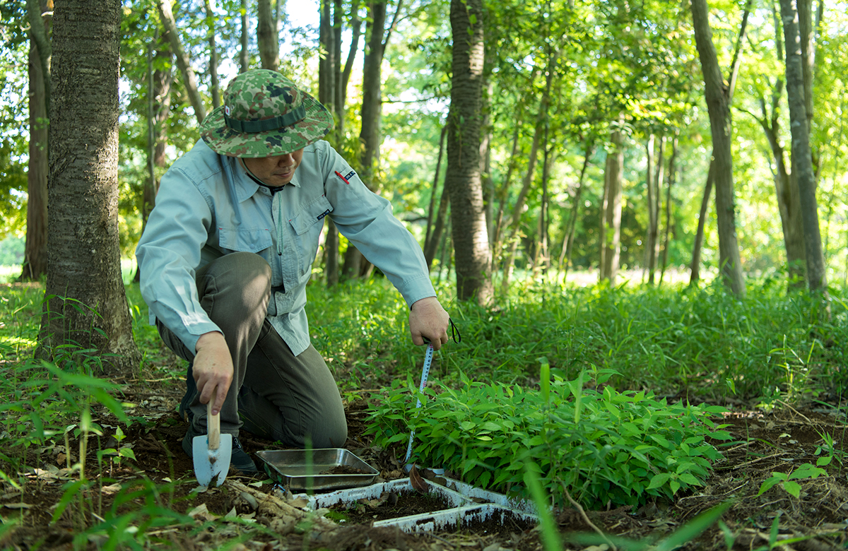 敷地南側に位置し1,500m²の敷地を有し、コナラ、シラカシ、ウワミズザクラ、ヤマザクラ、ヒノキ、スギ等が生育しています。豊かで災害に強い森林を作るために、保育ブロック工法の苗木づくりと根茎成長を調べる試験を行っています。